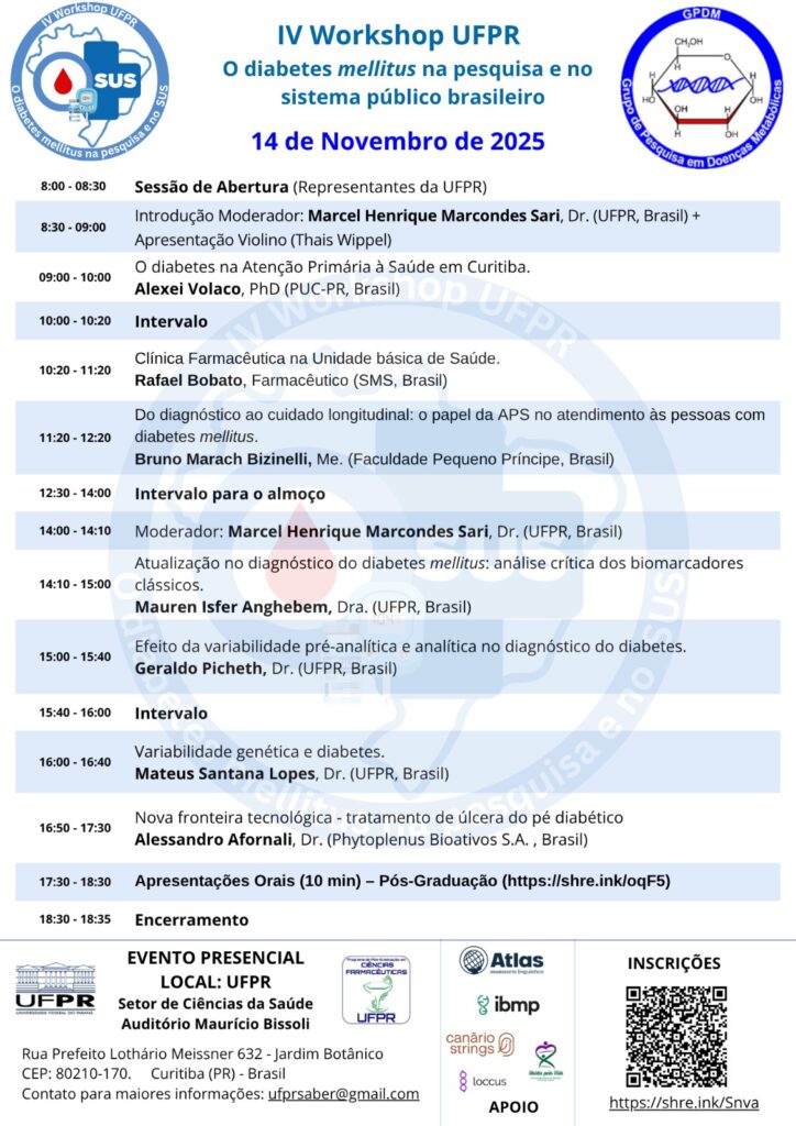 O IV Workshop UFPR, organizado pelo grupo GPDM do Programa de Pós-Graduação em Ciências Farmacêuticas da Universidade Federal do Paraná, convida todos os profissionais de saúde, estudantes e a comunidade para comparecerem ao evento, que será realizado no Auditório Maurício Bissoli no Campus Botânico da UFPR.